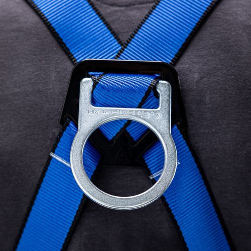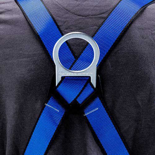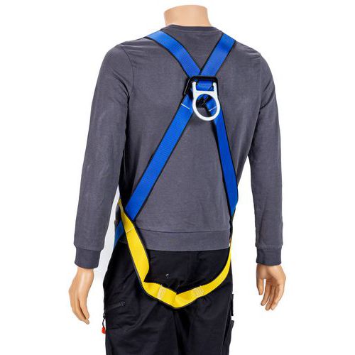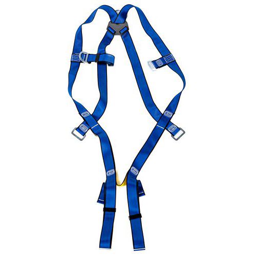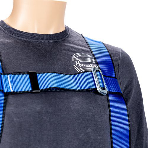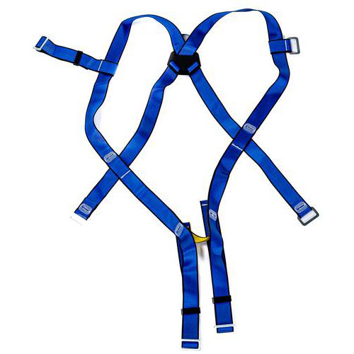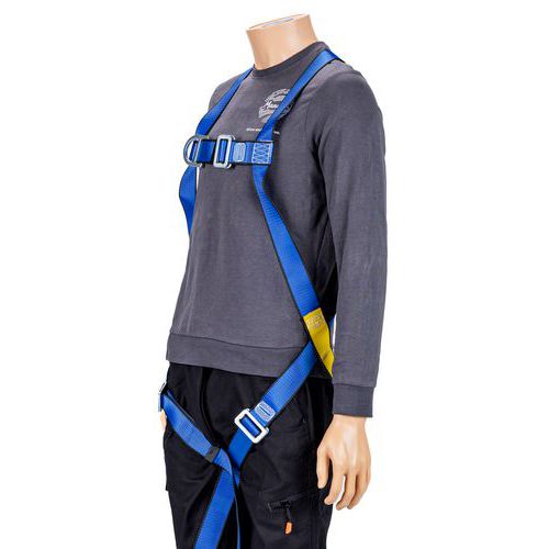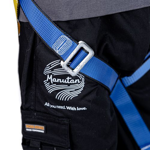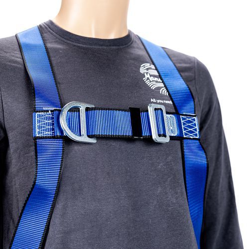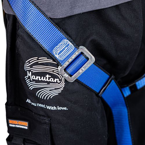 Esésbiztonsági heveder két rögzítési ponttal és energiaelnyelővel, CE minősítéssel a teljes biztonság érdekében. Robusztus a horganyzott acél szerelvényeknek és a nagy szakítószilárdságnak köszönhetően.