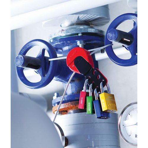 Szabadalmaztatott zármechanika huzallal a szelep kizárására. Akár 6 lakattal zárható (max. kengyelátmérő 9 mm). Műanyag zár, szilárd acélhuzal.