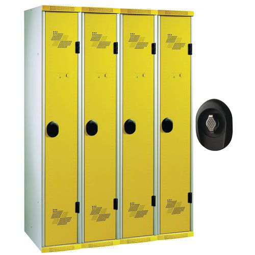 | Termék neve | Acial hegesztett öltözőszekrény, 4 rekeszes, 300 mm, forgóretesszel, szürke/sárga |