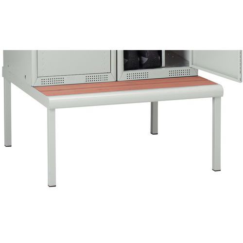 Fém öltözőszekrények alá elhelyezhető acél szerkezetű, műanyag ülőfelületű pad. Teak színű PVC-lécek. Állítható lábak. Ülőfelület szélessége: 30 cm.