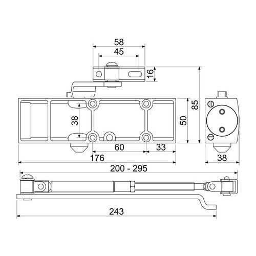 Beltéri ajtózáró ajtózáró beltéri ajtókhoz záróerő: 3 méretek ma x szé: 50 x 176 mm színe: ezüst max. ajtószélesség 950 mm és tömeg 65 kg EN 1154 alapján állítható zárási és billenési sebesség a kar a csomagolás része tűzbiztonsági tanúsítvány EN1634