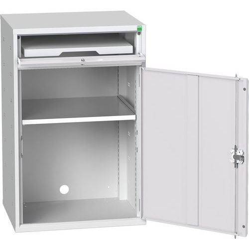 Munkahelyi számítástechnika biztonságos tárolására és használatára alkalmas munkaszámítógép szekrény. Hegesztett acélszerkezet, porszórt felületkezelés. Szekrény zárása hengeres bütykös zárral, külön a felső kihúzható polc a billentyűzetnek és az egérnek. Tartalmaz egy horganyzott, állítható magasságú polcot 75 kg teherbírással és kábelátvezetővel.
