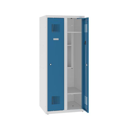 Alacsony, kétajtós hegesztett iskolai öltözőszekrények. Akár alsó tagozaton is jó választás. Kiváló minőségű acéllemezből készül. Porszórt felületkezeléssel. A szekrényben két könyvespolc, egy cipőtartó polc, 2 ruhaakasztó fogas, az ajtókon pedig öntapadós névtábla található. A ruhák kipárolgását hatékonyan elvezetik az ajtók alján és tetején található szellőzőrácsok. Az ajtók 90°-ban nyithatók. Hárompontos hengerzárral zárhatók.