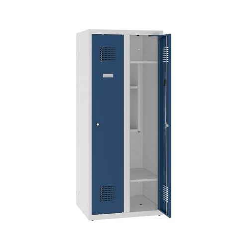 Alacsony, kétajtós hegesztett iskolai öltözőszekrények. Akár alsó tagozaton is jó választás. Kiváló minőségű acéllemezből készül. Porszórt felületkezeléssel. A szekrényben két könyvespolc, egy cipőtartó polc, 2 ruhaakasztó fogas, az ajtókon pedig öntapadós névtábla található. A ruhák kipárolgását hatékonyan elvezetik az ajtók alján és tetején található szellőzőrácsok. Az ajtók 90°-ban nyithatók. Hárompontos hengerzárral zárhatók.