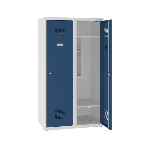 Kétajtós, alacsony öltözőszekrények. Akár alsó tagozaton is jó választás. Kiváló minőségű acéllemezből készül. Porszórt felületkezeléssel. A szekrényben két könyvespolc, egy cipőtartó polc, 2 ruhaakasztó fogas, az ajtókon pedig öntapadós névtábla található. A ruhák kipárolgását hatékonyan elvezetik az ajtók alján és tetején található szellőzőrácsok. Az ajtók 90°-ban nyithatók. Hárompontos hengerzárral zárhatók.
