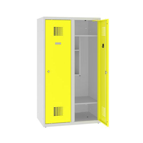 Kétajtós, alacsony öltözőszekrények. Akár alsó tagozaton is jó választás. Kiváló minőségű acéllemezből készül. Porszórt felületkezeléssel. A szekrényben két könyvespolc, egy cipőtartó polc, 2 ruhaakasztó fogas, az ajtókon pedig öntapadós névtábla található. A ruhák kipárolgását hatékonyan elvezetik az ajtók alján és tetején található szellőzőrácsok. Az ajtók 90°-ban nyithatók. Hárompontos hengerzárral zárhatók.