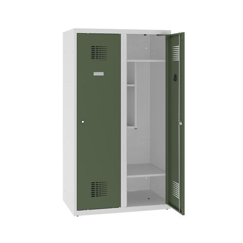 Kétajtós, alacsony öltözőszekrények. Akár alsó tagozaton is jó választás. Kiváló minőségű acéllemezből készül. Porszórt felületkezeléssel. A szekrényben két könyvespolc, egy cipőtartó polc, 2 ruhaakasztó fogas, az ajtókon pedig öntapadós névtábla található. A ruhák kipárolgását hatékonyan elvezetik az ajtók alján és tetején található szellőzőrácsok. Az ajtók 90°-ban nyithatók. Hárompontos hengerzárral zárhatók.