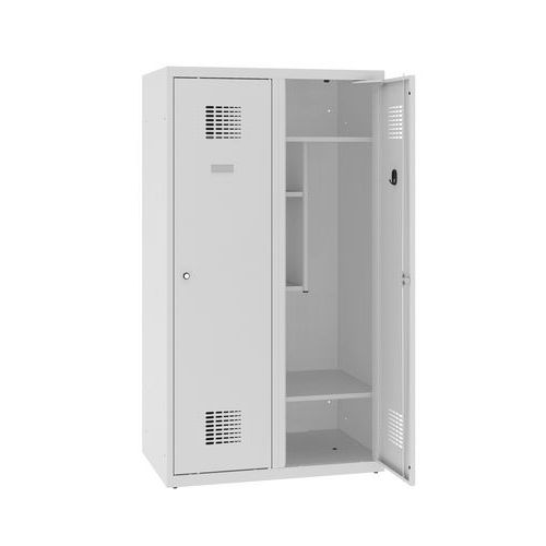 Alacsony, kétajtós hegesztett iskolai öltözőszekrények. Alsó tagozaton is jó választás. A szekrényben két könyvespolc, egy cipőtartó polc, 2 ruhaakasztó fogas, az ajtón pedig öntapadós névtábla található. Modern szellőzőrendszerrel a szerkényajtókban a jobb légáramlás érdekében. Az ajtók 90°-ban nyithatók. Kulcsra zárhatók, hengerzárral.