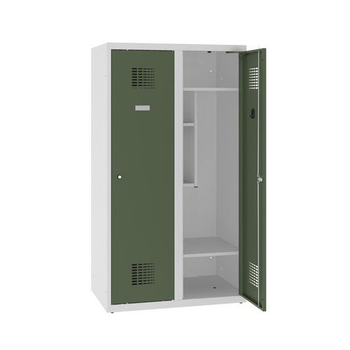 Alacsony, kétajtós hegesztett iskolai öltözőszekrények. Alsó tagozaton is jó választás. A szekrényben két könyvespolc, egy cipőtartó polc, 2 ruhaakasztó fogas, az ajtón pedig öntapadós névtábla található. Modern szellőzőrendszerrel a szerkényajtókban a jobb légáramlás érdekében. Az ajtók 90°-ban nyithatók. Kulcsra zárhatók, hengerzárral.