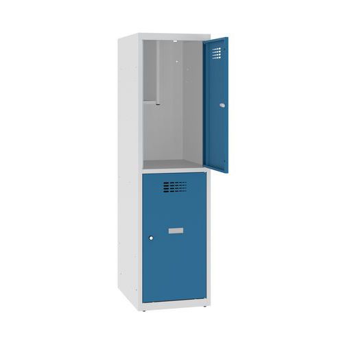 Alacsony, hegesztett öltözőszekrények két külön-külön zárható rekesszel. Iskolákba, kis magasságának köszönhetően alsó tagozaton is jó választás. Kiváló minőségű acéllemezből készül porszórt felületkezeléssel. A szekrényben két könyvespolc és egy ruhaakasztó fogas található. Öntapadós névtáblával az ajtókon. A jobb légáramlás érdekében az ajtók tetején szellőzőrácsok találhatók. Az ajtók 90°-ban nyithatók. Kulcsra zárhatók, hengerzárral