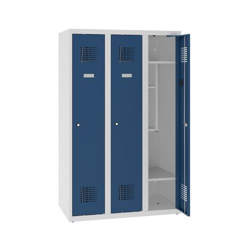 Alacsony iskolai öltözőszekrény, 3 ajtós, 300 mm, szürke/sötét kék, hárompontos hengerzárral Alacsony iskolai öltözőszekrény, 3 ajtós, 300 mm, szürke/sötét kék, hárompontos hengerzárral