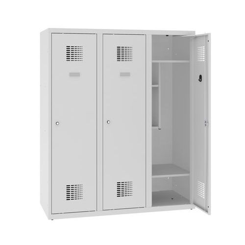 Alacsony, háromajtós öltözőszekrények. Akár alsó tagozaton is jó választás. Kiváló minőségű acéllemezből készül. Porszórt felületkezeléssel. A szekrényben két könyvespolc, egy cipőtartó polc, 2 ruhaakasztó fogas, az ajtókon pedig öntapadós névtábla található. A ruhák kipárolgását hatékonyan elvezetik az ajtók alján és tetején található szellőzőrácsok. Az ajtók 90°-ban nyithatók. Hárompontos hengerzárral zárhatók.