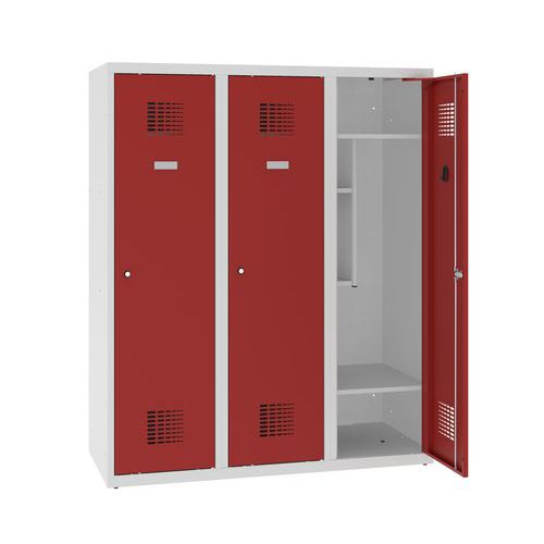 Alacsony, háromajtós öltözőszekrények. Akár alsó tagozaton is jó választás. Kiváló minőségű acéllemezből készül. Porszórt felületkezeléssel. A szekrényben két könyvespolc, egy cipőtartó polc, 2 ruhaakasztó fogas, az ajtókon pedig öntapadós névtábla található. A ruhák kipárolgását hatékonyan elvezetik az ajtók alján és tetején található szellőzőrácsok. Az ajtók 90°-ban nyithatók. Hárompontos hengerzárral zárhatók.