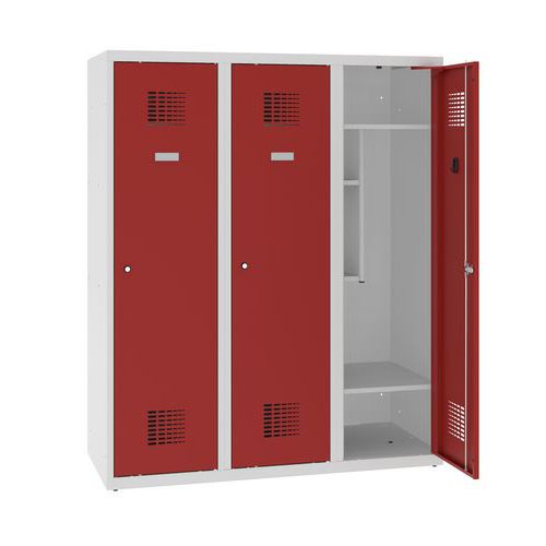 Alacsony iskolai öltözőszekrény, 3 ajtós, 400 mm, szürke/piros, hengerzárral Alacsony iskolai öltözőszekrény, 3 ajtós, 400 mm, szürke/piros, hengerzárral