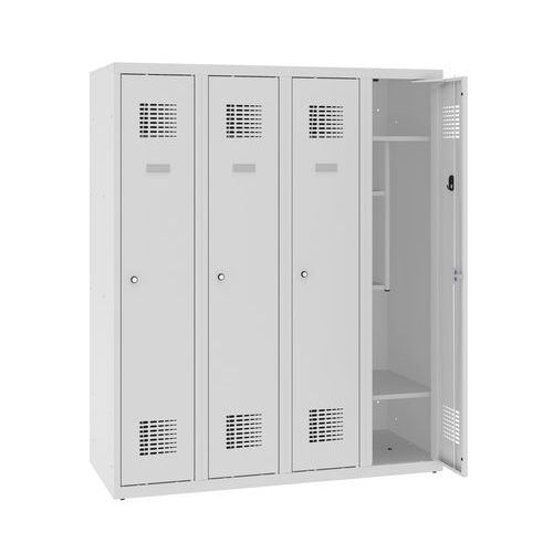 Alacsony, négyrekeszes hegesztett öltözőszekrények. Akár alsó tagozaton is jó választás. Kiváló minőségű acéllemezből készül. Porszórt felületkezeléssel. A szekrényben két könyvespolc, egy cipőtartó polc, 2 ruhaakasztó fogas, az ajtókon pedig öntapadós névtábla található. A ruhák kipárolgását hatékonyan elvezetik az ajtók alján és tetején található szellőzőrácsok. Az ajtók 90°-ban nyithatók. Hárompontos hengerzárral zárhatók.