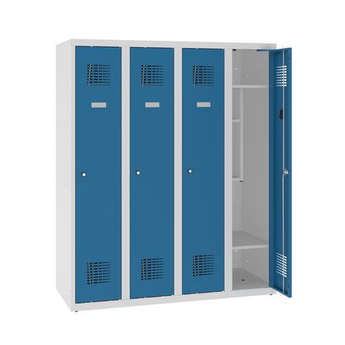 Alacsony, négyrekeszes hegesztett öltözőszekrények. Akár alsó tagozaton is jó választás. Kiváló minőségű acéllemezből készül. Porszórt felületkezeléssel. A szekrényben két könyvespolc, egy cipőtartó polc, 2 ruhaakasztó fogas, az ajtókon pedig öntapadós névtábla található. A ruhák kipárolgását hatékonyan elvezetik az ajtók alján és tetején található szellőzőrácsok. Az ajtók 90°-ban nyithatók. Hárompontos hengerzárral zárhatók.