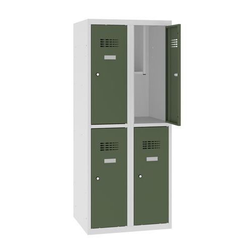 Négyrekeszes hegesztett iskolai öltözőszekrények. Iskolákba, kis magasságának köszönhetően alsó tagozaton is jó választás. Kiváló minőségű acéllemezből készül porszórt felületkezeléssel. A szekrényben két könyvespolc és egy ruhaakasztó fogas található. Öntapadós névtáblával az ajtókon. A jobb légáramlás érdekében az ajtók tetején szellőzőrácsok találhatók. Az ajtók 90°-ban nyithatók. Kulcsra zárhatók, hengerzárral.