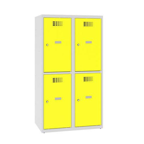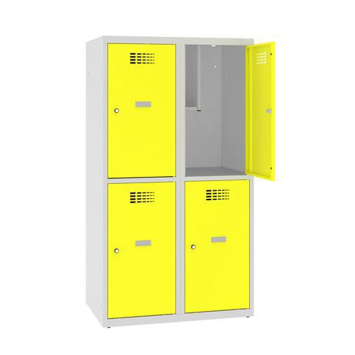 Alacsony, hegesztett öltözőszekrények négy külön-külön zárható rekesszel. Iskolákba, kis magasságának köszönhetően alsó tagozaton is jó választás. A szekrényben két könyvespolc és egy ruhaakasztó fogas található. Öntapadós névtáblával az ajtókon. A jobb légáramlás érdekében az ajtók tetején szellőzőrácsok találhatók. Az ajtók 90°-ban nyithatók. Kulcsra zárhatók, hengerzárral.