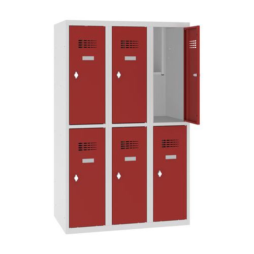 Hatrekeszes, alacsony, hegesztett iskolai öltözőszekrények. Iskolákba, kis magasságának köszönhetően alsó tagozaton is jó választás. Kiváló minőségű acéllemezből készül porszórt felületkezeléssel. A szekrényben két könyvespolc és egy ruhaakasztó fogas található. Öntapadós névtáblával az ajtókon. A jobb légáramlás érdekében az ajtók tetején szellőzőrácsok találhatók. Az ajtók 90°-ban nyithatók. Lakattal zárható forgóretesszel (a lakat nem alaptartozék).