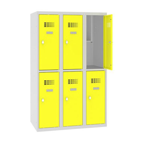 Alacsony iskolai öltözőszekrény, 6 rekeszes, 300 mm, szürke/sárga, forgóretesszel Alacsony iskolai öltözőszekrény, 6 rekeszes, 300 mm, szürke/sárga, forgóretesszel