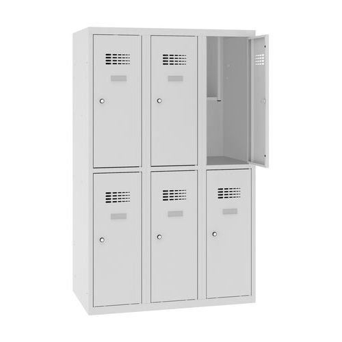 Hatrekeszes, alacsony, hegesztett iskolai öltözőszekrények. Iskolákba, kis magasságának köszönhetően alsó tagozaton is jó választás. Kiváló minőségű acéllemezből készül porszórt felületkezeléssel. A szekrényben két könyvespolc és egy ruhaakasztó fogas található. Öntapadós névtáblával az ajtókon. A jobb légáramlás érdekében az ajtók tetején szellőzőrácsok találhatók. Az ajtók 90°-ban nyithatók. Kulcsra zárhatók, hengerzárral.