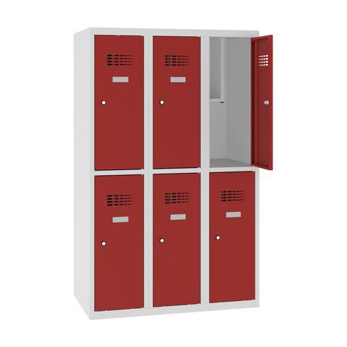 Alacsony iskolai öltözőszekrény, 6 rekeszes, 300 mm, szürke/piros, hengerzárral Alacsony iskolai öltözőszekrény, 6 rekeszes, 300 mm, szürke/piros, hengerzárral