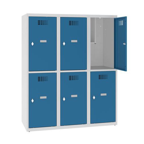Alacsony, hegesztett öltözőszekrények hat külön-külön zárható rekesszel. Iskolákba, kis magasságának köszönhetően alsó tagozaton is jó választás. A szekrényben két könyvespolc és egy ruhaakasztó fogas található. Öntapadós névtáblával az ajtókon. A jobb légáramlás érdekében az ajtók tetején szellőzőrácsok találhatók. Az ajtók 90°-ban nyithatók. Lakattal zárható forgóretesszel (a lakat nem alaptartozék).