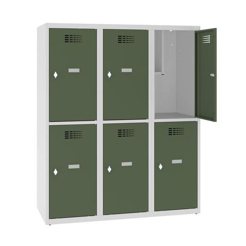 Alacsony, hegesztett öltözőszekrények hat külön-külön zárható rekesszel. Iskolákba, kis magasságának köszönhetően alsó tagozaton is jó választás. A szekrényben két könyvespolc és egy ruhaakasztó fogas található. Öntapadós névtáblával az ajtókon. A jobb légáramlás érdekében az ajtók tetején szellőzőrácsok találhatók. Az ajtók 90°-ban nyithatók. Lakattal zárható forgóretesszel (a lakat nem alaptartozék).