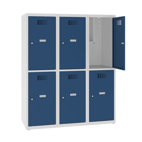 Alacsony, hegesztett öltözőszekrények hat külön-külön zárható rekesszel. Iskolákba, kis magasságának köszönhetően alsó tagozaton is jó választás. A szekrényben két könyvespolc és egy ruhaakasztó fogas található. Öntapadós névtáblával az ajtókon. A jobb légáramlás érdekében az ajtók tetején szellőzőrácsok találhatók. Az ajtók 90°-ban nyithatók. Kulcsra zárhatók, hengerzárral.