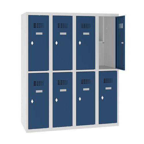 Alacsony, hegesztett öltözőszekrények nyolc külön-külön zárható rekesszel. Iskolákba, kis magasságának köszönhetően alsó tagozaton is jó választás. Kiváló minőségű acéllemezből készül porszórt felületkezeléssel. A szekrényben két könyvespolc és egy ruhaakasztó fogas található. Öntapadós névtáblával az ajtókon. A jobb légáramlás érdekében az ajtók tetején szellőzőrácsok találhatók. Az ajtók 90°-ban nyithatók. Lakattal zárható forgóretesszel (a lakat nem alaptartozék).