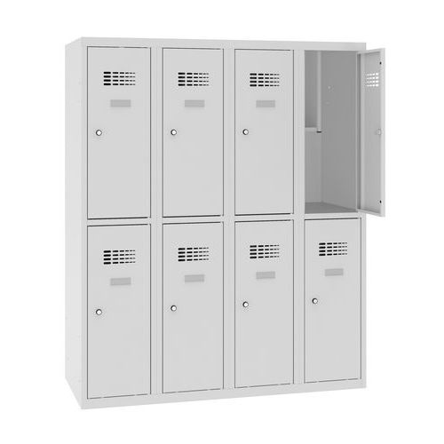 Alacsony, hegesztett öltözőszekrények nyolc külön-külön zárható rekesszel. Iskolákba, kis magasságának köszönhetően alsó tagozaton is jó választás. A szekrényben két könyvespolc és egy ruhaakasztó fogas található. Öntapadós névtáblával az ajtókon. A jobb légáramlás érdekében az ajtók tetején szellőzőrácsok találhatók. Az ajtók 90°-ban nyithatók. Kulcsra zárhatók, hengerzárral