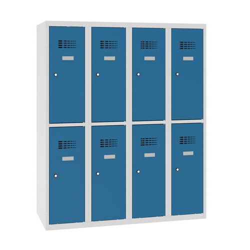 Alacsony, hegesztett öltözőszekrények nyolc külön-külön zárható rekesszel. Iskolákba, kis magasságának köszönhetően alsó tagozaton is jó választás. A szekrényben két könyvespolc és egy ruhaakasztó fogas található. Öntapadós névtáblával az ajtókon. A jobb légáramlás érdekében az ajtók tetején szellőzőrácsok találhatók. Az ajtók 90°-ban nyithatók. Kulcsra zárhatók, hengerzárral