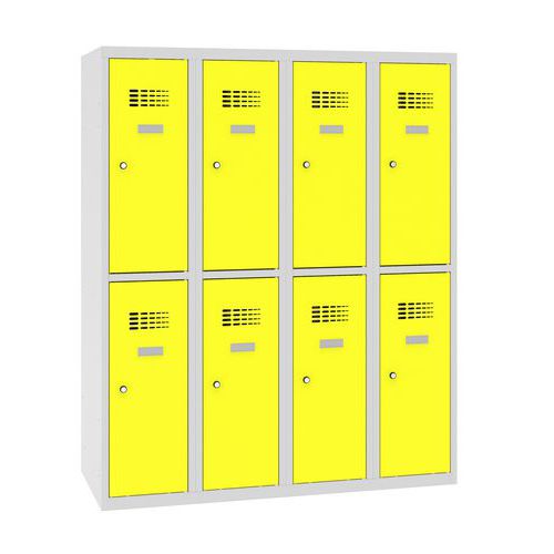 Alacsony, hegesztett öltözőszekrények nyolc külön-külön zárható rekesszel. Iskolákba, kis magasságának köszönhetően alsó tagozaton is jó választás. A szekrényben két könyvespolc és egy ruhaakasztó fogas található. Öntapadós névtáblával az ajtókon. A jobb légáramlás érdekében az ajtók tetején szellőzőrácsok találhatók. Az ajtók 90°-ban nyithatók. Kulcsra zárhatók, hengerzárral