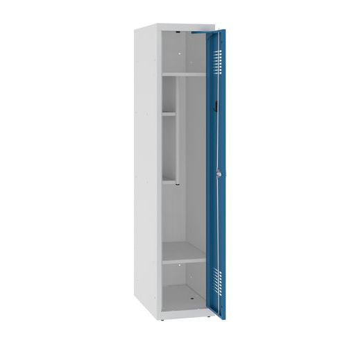 Egyajtós hegesztett iskolai öltözőszekrények. Iskolákba, kis magasságának köszönhetően alsó tagozaton is jó választás. Kiváló minőségű acéllemezből készül porszórt felületkezeléssel. A szekrényben két könyvespolc, egy cipőtartó polc és 2 ruhaakasztó fogas található. Öntapadós névtáblával az ajtón. Szellőzőrácsos ajtóval a jobb légáramlás érdekében. Az ajtó 90°-ban nyitható. Kulcsra zárható, hengerzárral.