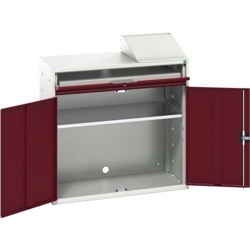 Munkahelyi számítástechnika biztonságos tárolására és használatára alkalmas munkaszámítógép szekrény. Hegesztett acélszerkezet, porszórt felületkezelés. Szekrény zárása hengeres bütykös zárral, külön a felső kihúzható polc a billentyűzetnek és az egérnek. Tartalmaz egy horganyzott, állítható magasságú polcot, 75 kg teherbírású, kábelnyílással és egy ferde íróasztallal.