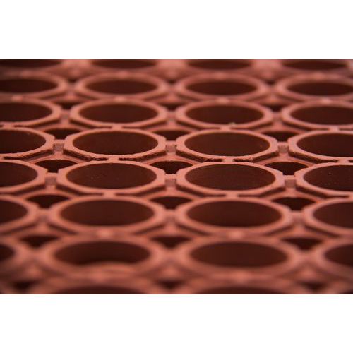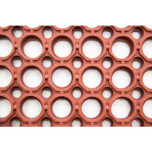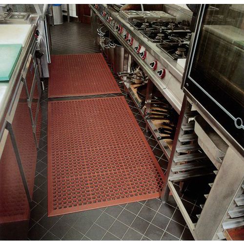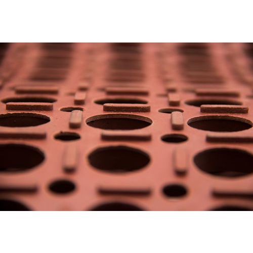 - Ipari álláskönnyítő szőnyeg természetes gumiból, főleg gasztronómiai üzemekben történő használatra. A nagy nyílások megkönnyítik a könnyű folyadékelvezetést. A lejtős élek csökkentik a megbotlás veszélyét, és növelik a biztonságot. Külön kérésre a szőnyegek akár magasabb nitril tartalommal is szállíthatók zsírosabb környezet esetén.