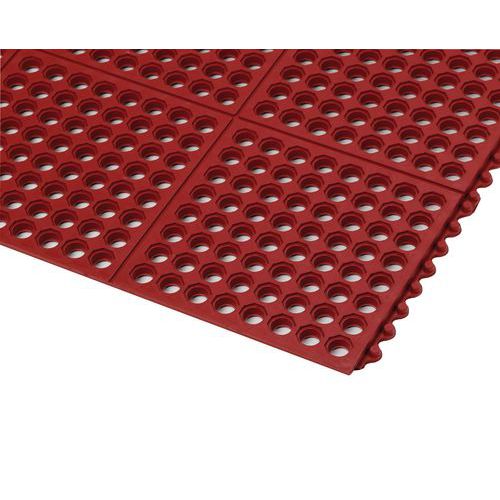 - Az álláskönnyítő szőnyeg alkalmas frekventált munkakörnyezetbe, élelmiszer- és vendéglátóiparba. Az anyag ellenálló a kenőanyagokkal, növényi olajokkal és állati zsiradékkal szemben. A lyukak lehetővé teszik a vízelvezetést a felületéről. Az egyes padlóburkoló lapok összekapcsolhatók. Kiegészíthető lejtős élekkel.