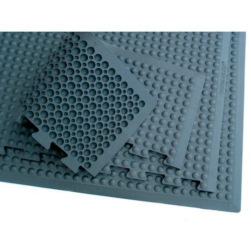 - A gumiból készült álláskönnyítő ipari szőnyegek kiválóan alkalmasak a kis mennyiségű forgácsot tartalmazó helyiségekbe. A lejtős éllel rendelkező szőnyegek és a buborékos felszín kiválóan elnyelik a rezgéseket, valamint korlátozzák a csúszásveszélyt. A buborékok alatti légpárnák hatékonyan csökkentik a láb és a hát fájdalmait. A szőnyegek nagyobb egységekbe kapcsolhatók a puzzle formájú zárakkal.