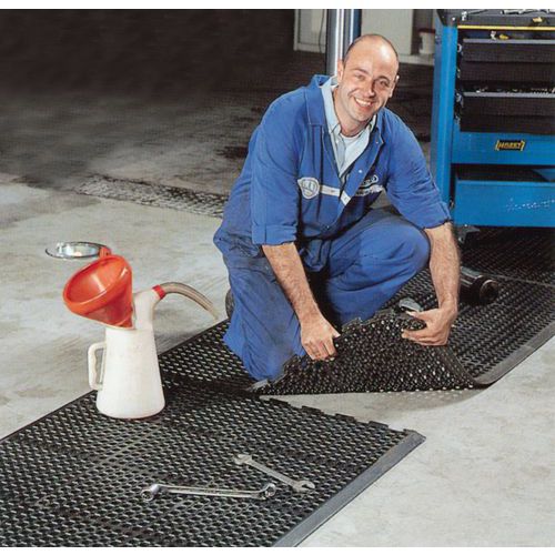 - Az álláskönnyítő szőnyeg megmunkáló központokban, esztergapadoknál, marógépeknél, autószervizekben stb. használható. A drénnyílások elvezetik a folyadékot a felületről. A megfelelő stabilitást a szőnyeg tömege biztosítja. A lejtős él megakadályozza a megbotlást, és lehetővé teszi a kocsik felgördülését.