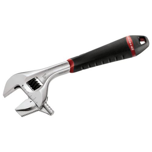 Állítható kétoldalas pofás kulcs. Könnyű króm test. Soft Grip fogantyú puha anyagból. Lapos oldal a munkadarabok sérülésének elkerülése érdekében. Finom fogazott oldal a csövek és egyéb alkatrészek erős meghúzásához (jó tapadás és nagy nyomaték). Vékony pofaprofil a jobb hozzáférhetőség érdekében. 22°-os dőlésszögű fej a jobb hozzáférés érdekében. Extra széles nyílás a nagyobb sokoldalúság érdekében. Beosztás mm-ben az egyik oldalon.