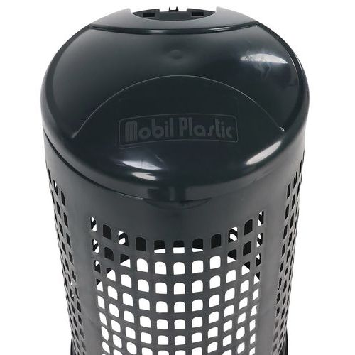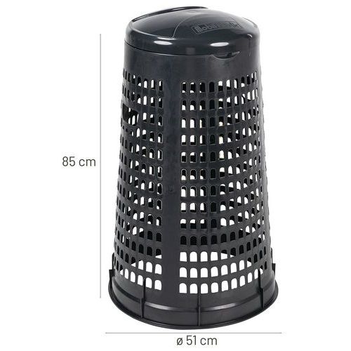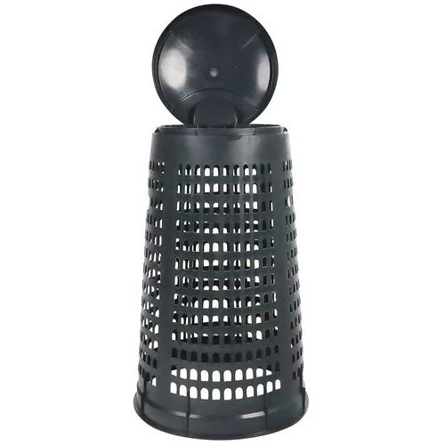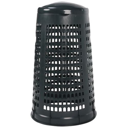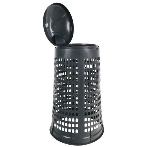 Műanyag állványok színes fedéllel hulladékzsákra. Alkalmas 110 literes hulladékzsák rögzítőgyűrűvel történő rögzítésére. A lyukacsos szerkezet úgy készül, hogy a szemetes zsákot ne fújhassa el a szél. Teljes mértékben újrahasznosítható HDPE anyagból készült, az állvány rakásolható.
