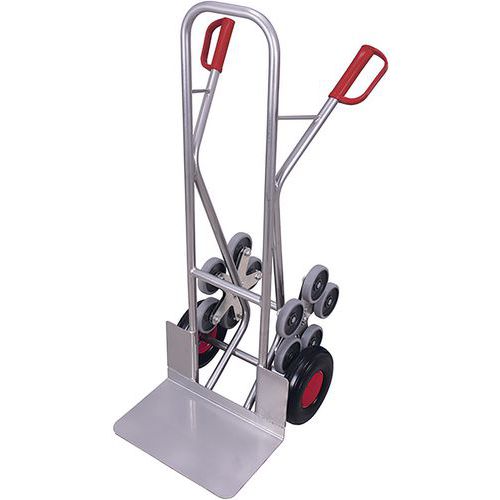 Alumínium lépcsős kocsi teherszállításhoz. Szürke hőre lágyuló gumiból készült ötcsillagos kerekek műanyag peremen. Vödör méretei 480 x 300 mm. Hegesztett alumínium csövekből készült. Műanyag fogantyúk biztonsági védelemmel a kézsérülések megelőzésére. Gumiabroncsok acélfelnire vagy tömörgumi kerekek speciális műanyag felnire, precíziós golyóscsapágyakkal és műanyag kerékburkolattal. Teherbírás (kg) : 200 kg