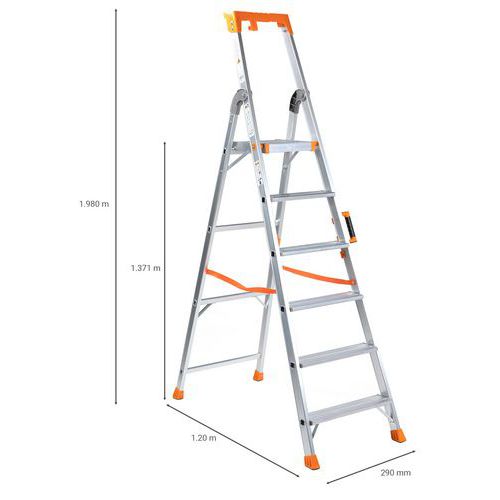 Összecsukható alumínium fellépő, egyoldali használattal, alkalmas építőipari munkákra vagy raktárakban. Oldalon fogantyúval a könnyebb áthelyezésért, és az áthelyezéskor véletlen lehajtás elleni biztosítékkal rendelkezik. A korlát része egy szerszámok és apró tárgyak elhelyezésére szolgáló praktikus tárolópolc, egy tégelytartóval együtt. Bordázott csúszásgátló felületű fokok. A fokok közötti távolság 25 cm. Megfelelnek a EN 131-1, EN 131-2/A2, EN 131-3 szabványnak. Max. terhelés (kg) : 150 kg Gyártói garancia az ügyfélnek : 10 év