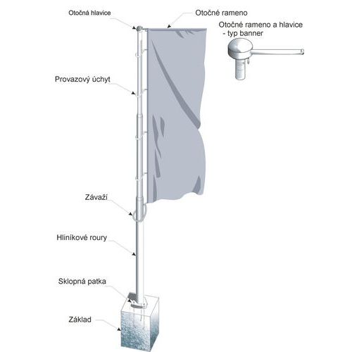 Alumínium zászlótartó árbocok forgó karral a zászló rögzítéséhez. Az árbocok két (5 - 6 m) vagy három (7 - 10 m) részből állnak. A zászló az egyes részek kihúzásával és betolásával tűzhető ki és szedhető le. Az eloxált felület nagyobb ellenállóságot biztosít az időjárás viszontagságaival szemben. magassága: 5 – 10 m átmérő (lent/középen/fent): 80/65/50 cm anyaga: alumínium elemek száma: 2 - 3 zászló rögzítése: forgó kar, műanyag szalagok, ellensúly a kar hossza: 160 cm rögzítés típusa: bebetonozás tömege: 14,1 - 24,3 kg felületkezelés ezüst eloxálással, ellensúllyal, lehajtható talppal, POE rögzítőkkel együtt szállítjuk