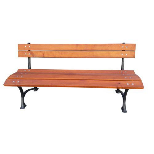 Parkpad háttámlával, amely alkalmas parkokba, játszóterekre és más kültéri területekre. Ülés és háttámla éger keményfából készült. A deszkákat marják, csiszolják és mahagóni impregnálással kezelik. A lécek vastagsága 32/35 mm (150/180 cm-es pad). A deszkákon előfúrt lyukak vannak a csavarok számára. Nagyon erős és stabil szerkezet, fekete színű öntöttvasból készült.