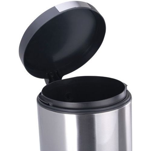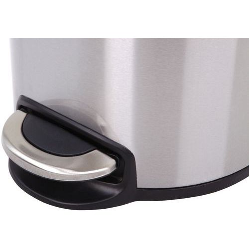 Kör alakú szemetes műanyag fedéllel és rozsdamentes acél alapról felemelt pedállal. Műanyag béléssel és csendes zárással.
