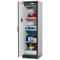 Biztonsági tárolószekrény gyúlékony és veszélyes anyagok, folyadékok tárolására. Nagyon masszív ház melamingyantából, speciális belső égésgátló panelekkel. A 3 zsanérra akasztott fémajtó 90°-ban nyílik, és a szekrény kényelmes használata érdekében bármilyen pozícióban nyitva marad. Automatikus zárás tűz esetén. A szekrény hengerzárral zárható színkódos nyitásjelzővel (piros/zöld). A légcserét beépített légcsatornák biztosítják, melyekkel a szellőztető rendszerhez csatlakoztatható (DN 75). A biztonsági szekrény 3 db 75 kg teherbírású polcot és egy alsó, 33 l űrtartalmú rácsrostélyos tálcát tartalmaz. Felületkezelés porszórással RAL 7016 antracit színben és jellegzetes RAL 1004 sárga színű ajtóval. Megfelel a következő szabványoknak: EN 14470-1 (30 perc), EN 16121, EN 16122, GS, CE.