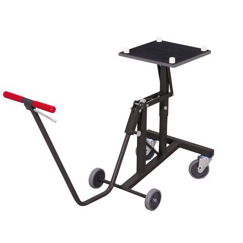Hegesztett acél kocsi asztalok szállításához. Húzó-/tolórúd fogantyúkkal, beleértve az emelőmozgás reteszelésére szolgáló kart. Ágyfelület bordázott gumiborítással és 4 fehér gumilábbal. Szürke, nyommentes, termoplasztikus gumi kerekek műanyag felnin, precíziós golyóscsapágyakkal. Két fix támasztókerék és két forgókerék. Vázfelület-kezelés RAL skála szerinti porfestékkel. Ütés- és karcálló.