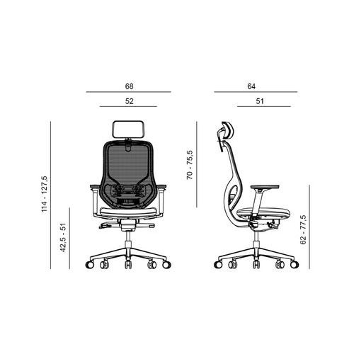Atomic irodai szék légáteresztő, magas háttámlával, kárpitozott ülőlappal és fejtámlával. Állítható mélységű, kényelmes, 90 mm vastag kárpitozott ülőlappal. Ötkarú nylon fekete lábkereszt kellően széles alátámasztással a maximális stabilitás és oldaltartás érdekében. Állítható magasságú és mélységű deréktámasszal. A deréktámasz magassága 75 mm-es, mélysége 20 mm-es tartományban állítható. Állítható magasságú és dőlésszögű fejtámlával. A magassága 55 mm-es tartományban állítható. 3D-s, magasságban, dőlésszögben és hosszirányban állítható kartámaszok puha tapintású felülettel. A karfa magassága a padlótól 62-77,5 cm. 4 pozícióban rögzíthető szinkronmechanikával és a használója súlyához automatikusan igazodó billenési merevséggel. Bármilyen típusú padlóhoz alkalmas Ø 60 mm-es kerekek gumi abronccsal. Tanúsítványok: ROHS, REACH, PAHS, BIFMA EN 1335 szabvány. A szék teljes magassága: 114,5-127,5 cm. A szövethuzat és a háló összetétele: 100% poliészter.