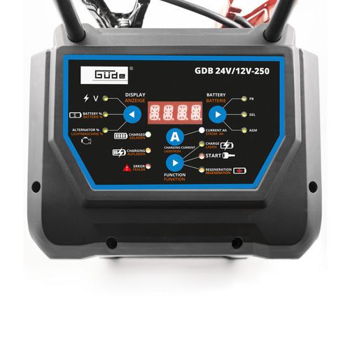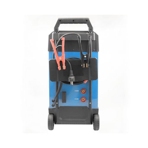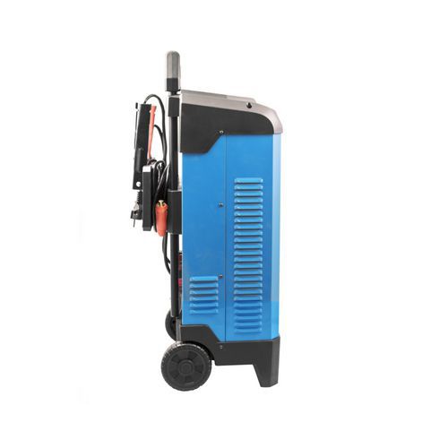 Mikroprocesszor egységgel vezérelt automatikus autóakkumulátor töltő alkalmas minden hétköznapi autó akkutöltésére (ideértve a teherautót is). Közvetlen és kímélő 10 fokozatú akkumulátor töltés a járműben. Áttekinthető LED kijelző töltöttség állapot jelzővel (%), töltőáram jelzővel (A) és töltőfeszültség jelzővel (V). Felélesztés funkció a teljesen lemerült akkumulátornál (1,5 V-nál aktiválódik). Négy fokozatú töltőáram 10/20/35/50 A, teljesítményfelvétel 6 000 W. Indítóáram 250 Ah (1,5 V-nál). Akkumulátor kapacitás 20 - 550 Ah. Min. biztosítás 16 A. A szokásos 12 V-os s 24 V-os akkumulátorokra, használható akkumulátortípusok PB (ólom), GEL (zselés), AGM (felitatott üvegszálas), WET (vizes/savas) és MF (karbantartásmentes). Túltöltés, zárlat, átpolarizálódás és a túlmelegedés elleni védelem. Szigetelt fogantyús csipeszek. 10 db kiegészítő 100 A hőkioldó. Könnyen mozgatható a két görgővel és a fogantyúval.